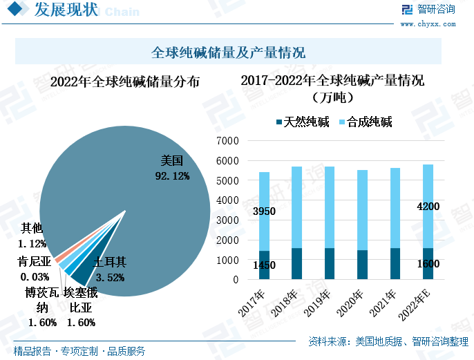 全球純堿儲量及產(chǎn)量情況 圖片來源/智研咨詢