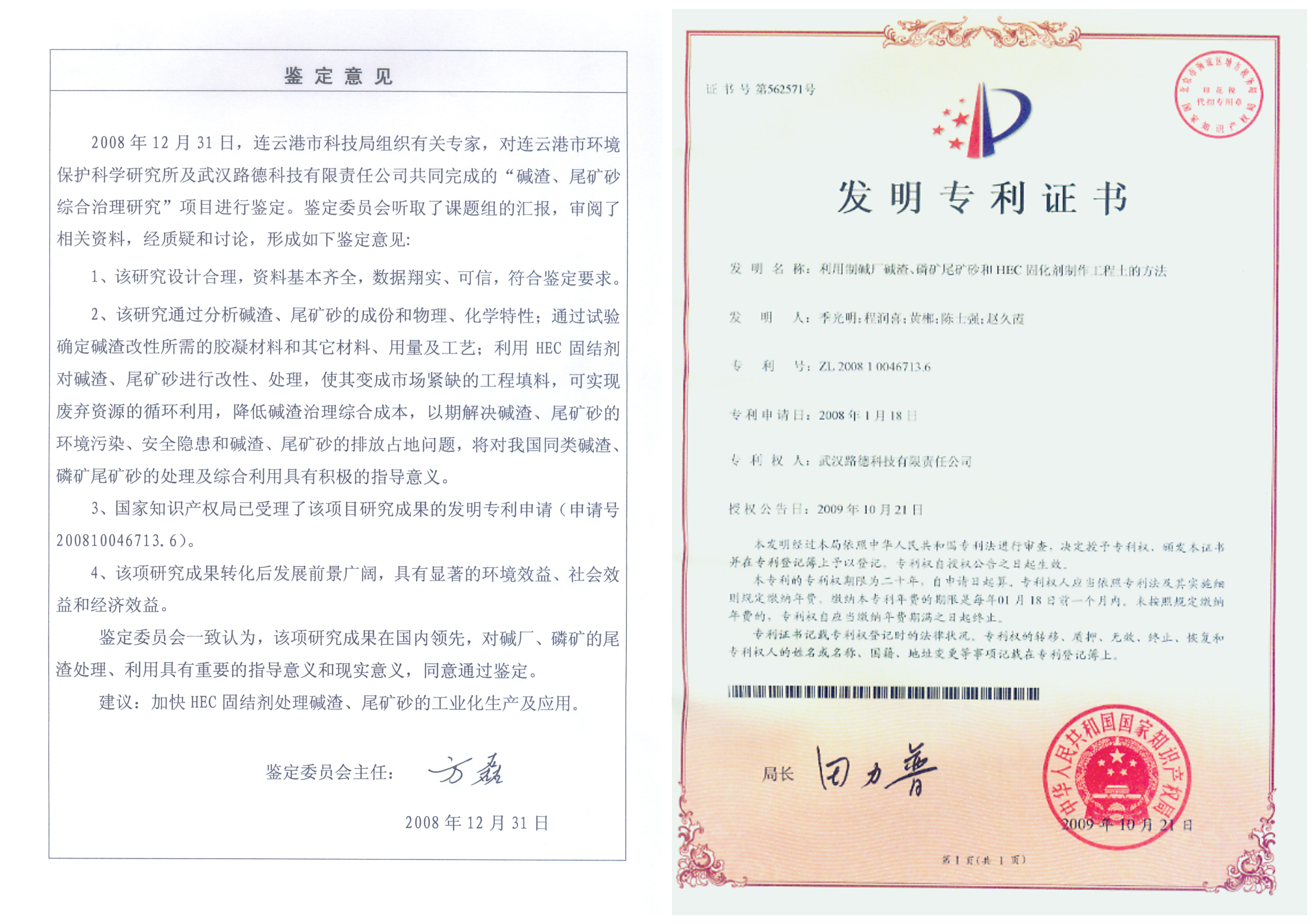 2009年10月21日,該技術(shù)又摘得一項桂冠:國家知識產(chǎn)權(quán)局授予的國家發(fā)明專利證書(“利用制堿廠堿渣、磷礦尾礦砂和HEC固化劑制作工程土的方法”、發(fā)明專利號ZL200810046713.6)。