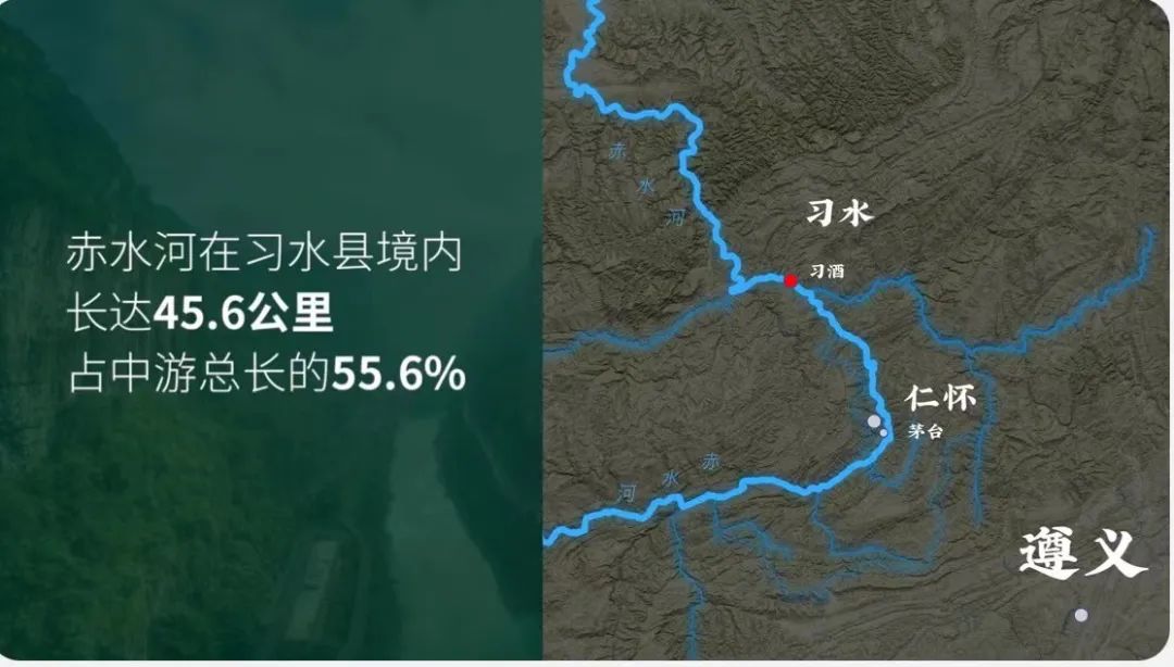 在習(xí)水縣境內(nèi),赤水河長(zhǎng)達(dá)45.6公里,占中游總長(zhǎng)的55.6%,地處赤水河流域優(yōu)質(zhì)醬酒核心腹地的區(qū)位優(yōu)勢(shì),為習(xí)水產(chǎn)區(qū)的強(qiáng)勢(shì)崛起打下了堅(jiān)實(shí)的基礎(chǔ)。