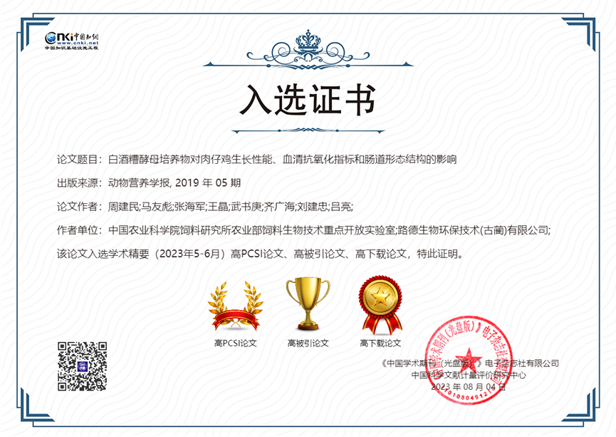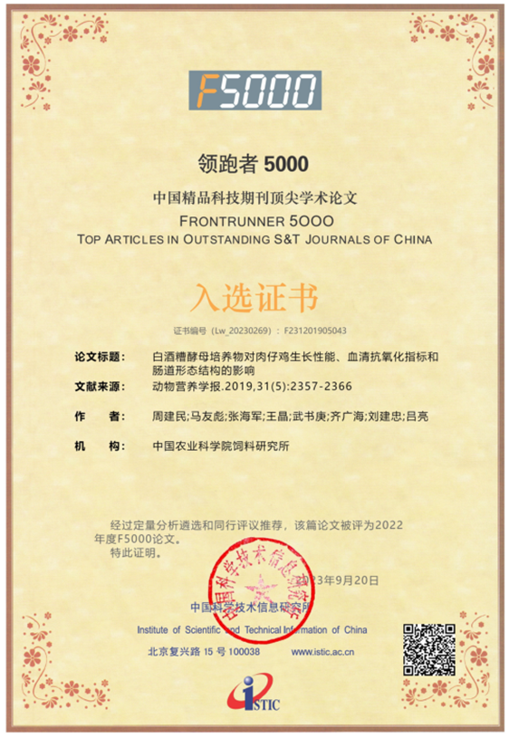 公司與中國農(nóng)業(yè)科學(xué)院飼料研究所家禽營養(yǎng)與飼料創(chuàng)新團(tuán)隊(duì)共同完成并發(fā)表于《動物營養(yǎng)學(xué)報》(2019,31(5): 2357-2366)的學(xué)術(shù)論文—《白酒糟酵母培養(yǎng)物對肉仔雞生長性能、血清抗氧化指標(biāo)和腸道形態(tài)結(jié)構(gòu)的影響》,入選2022年度“領(lǐng)跑者5000—中國精品科技期刊頂尖學(xué)術(shù)論文(F5000)”和學(xué)術(shù)精要(2023年5-6月)高PCSI論文、高被引論文和高下載論文。