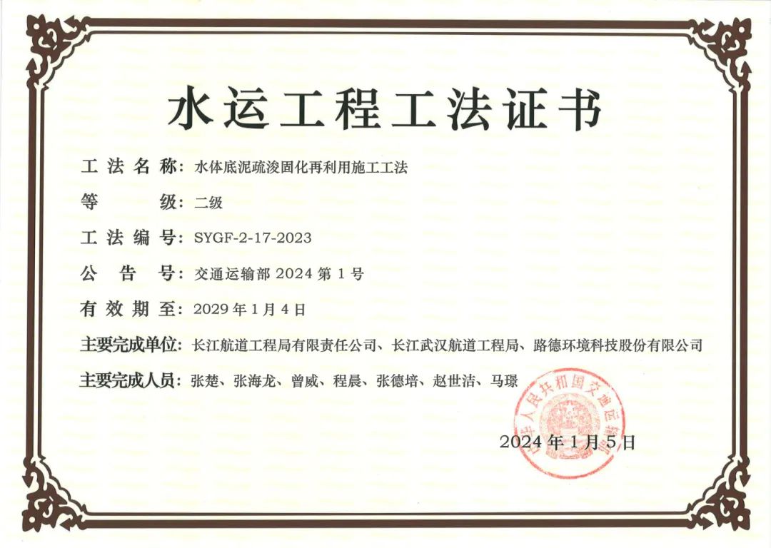 近期,交通運輸部公布了2023年度水運工程工法評審結(jié)果,路德環(huán)境聯(lián)合長江航道工程局有限責任公司、長江武漢航道工程局共同申報的“水體底泥疏浚固化再利用施工工法”榮獲交通運輸部2023年度水運工程二級工法。