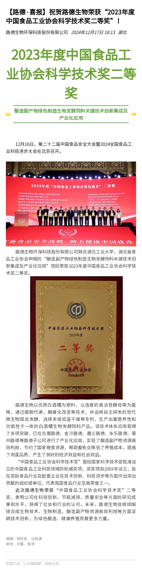 【路德·喜報】祝賀路德生物榮獲“2023年度中國食品工業(yè)協(xié)會科學(xué)技術(shù)獎二等獎”!