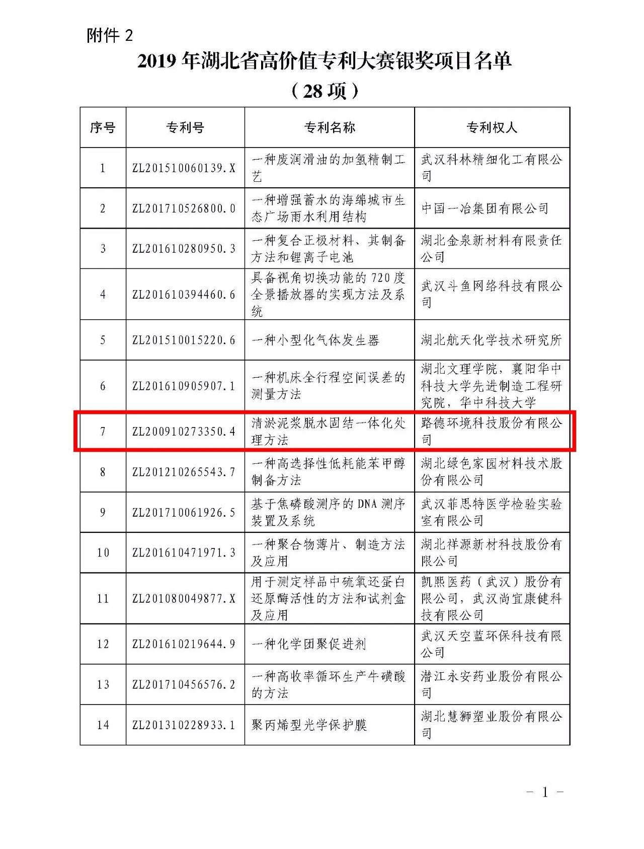6月12日,湖北省知識產(chǎn)權(quán)局公布2019年湖北省高價值專利大賽結(jié)果。路德環(huán)境科技股份有限公司呈報的《清淤泥漿脫水固結(jié)一體化處理方法》榮獲2019年湖北省高價值專利大賽銀獎。